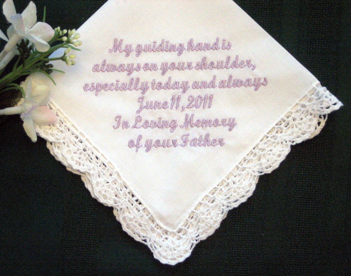 The is a beautiful memorial for the bride in honer of her father. This handkerchief is a personalized gift. Made of cotton and hand worked lace around the edge.