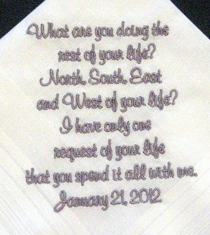 This personalized wedding handkerchief will pop the question for you. This handkerchief can be for the bride or the groom and will make your life a little easier.