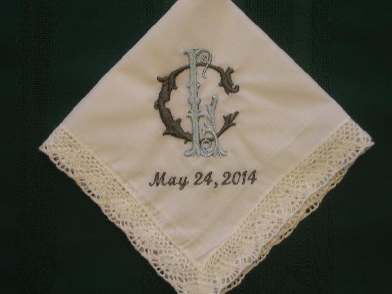 This personalized wedding handkerchief includes 2 initials. They can be your initials or the first initials of the bride and groom You may choose any colors on the chart.