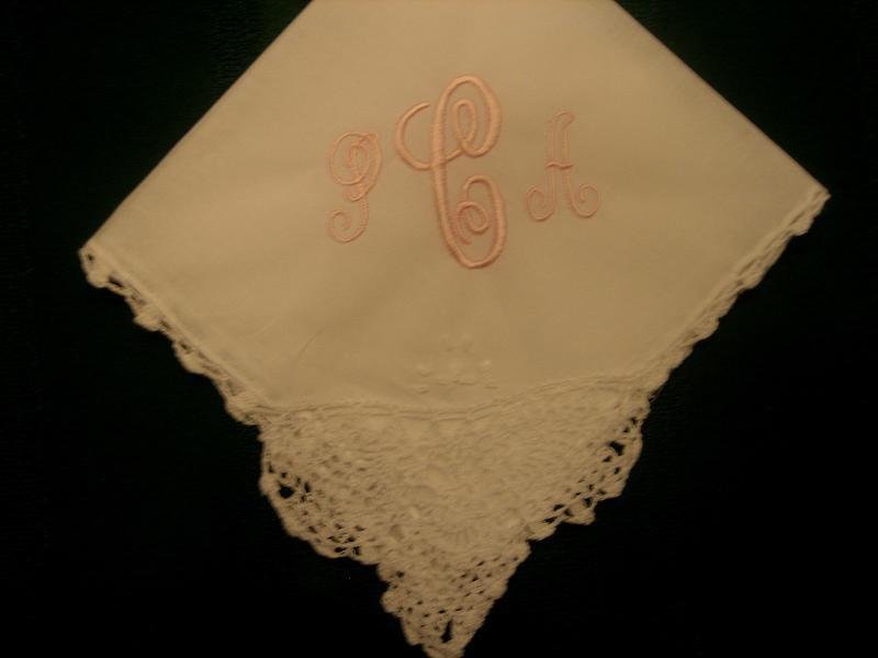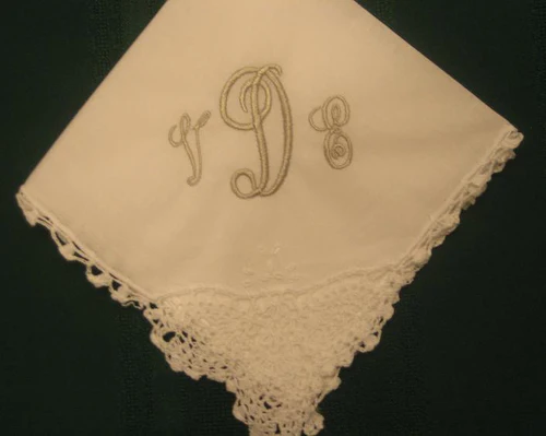 This personalized wedding handkerchief with beautiful lace adornment can be done with your initials or for your gift recipient. This is a very delicate and dainty cotton hanky measuring 12x12in. You may choose any color thread. A perfect gift for any lady on any occasion.